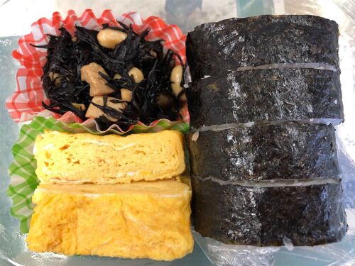 iPhone8 Plus 海苔巻き弁当持って行った。これよくよく考えたらいつもよりおかずが一品減ってる分、量が少ないことになっているのでは…?? 朝作ってる時はバタバタで気づかなかったけど、いざ食べるとなるとしまった!という気持ちに。これで夕方まで過ごさ…