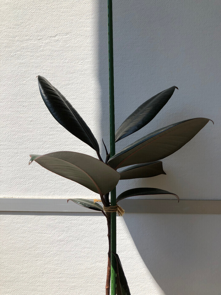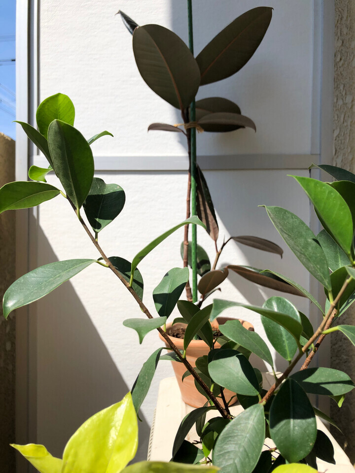 幹が細いけど葉が大きいのでバランスを崩してしまいそうになるため、緑の支柱つきになっているのが現状。これで支柱外したら多分ぐねぐね曲がった形になってしまうし、ちょっとの風で折れるかもしれない。でもメンテしているときはこの支柱が目に入ってしまわないかちょっと怖い…あとゴムノキとしてもあまり良い気分じゃないだろうし。早めにとってあげたいんだが、さてどうすっかな…。