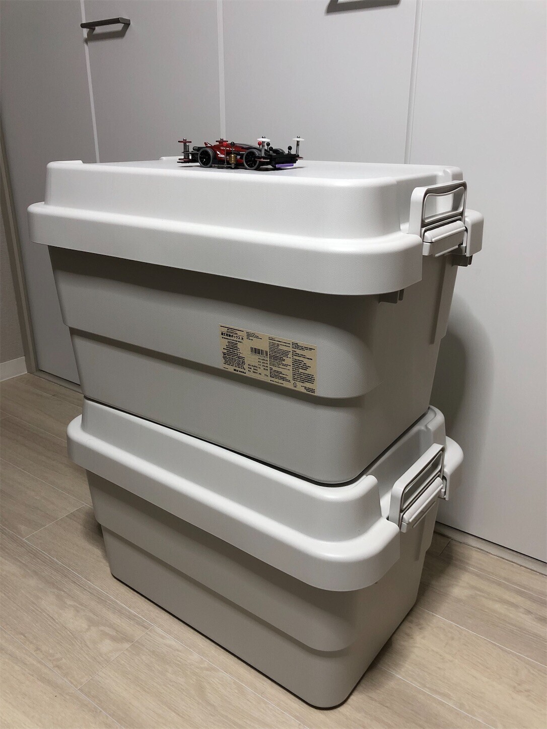 ひとつは園芸グッズを入れていて、もう一つは防災グッズを入れる予定(今は何も入れていない)。これをどこに置けば良いか。サイズ感が分かりにくいかと思ったのでミニ四駆を置いてみたが、何となく分かっていただけるだろうか。