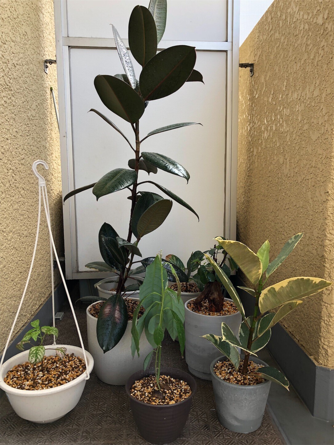 日差しが強いので観葉植物も基本的に室内の明るいところ管理なんだけど、熱帯地方のものは外の方がいいのではないかと思って今日はベランダに出した。