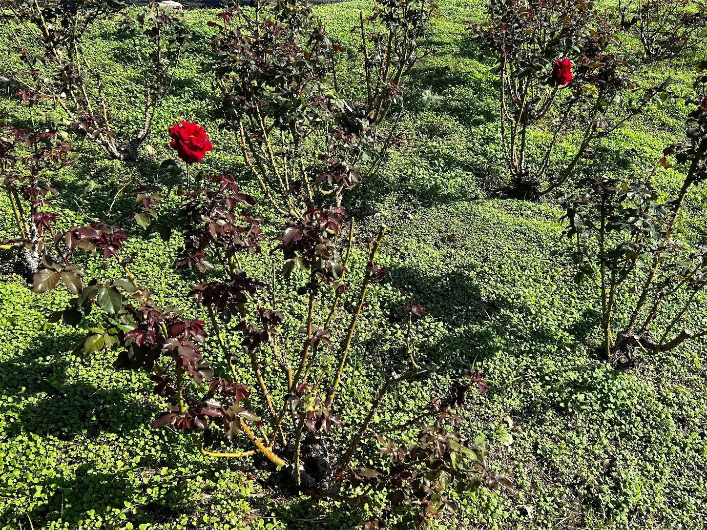 咲いてないというか、余計な枝葉を落としてあるだけあって、地面の草が日当たりよくなりすぎてどんどん繁っている感がある。緑緑してるなあと思って見たらクローバーみたいな葉っぱで(でもクローバーではない)いったいこれ何だろう。コケとも違うし、何か面白いな。